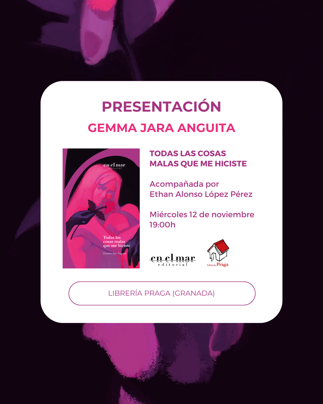 Mañana, a las 19:00 tenemos en la Praga a @iwikpines --Gemma Jara Anguita-- presentando su libro "Todas las cosas malas que me hiciste" de @edicionesenelmar acompañada de Ethan A. López.